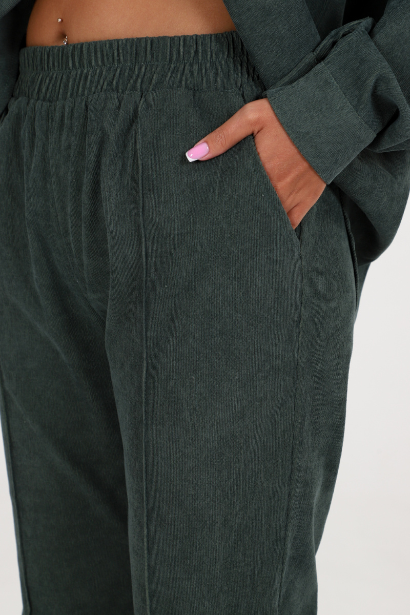 Брюки в данном костюме оснащены эластичной резинкой, что обеспечивает комфорт и идеальную посадку на любую фигуру. Изготовлены они из высококачественного велюра, который приятен на ощупь и обеспечивает долговечность изделия.
