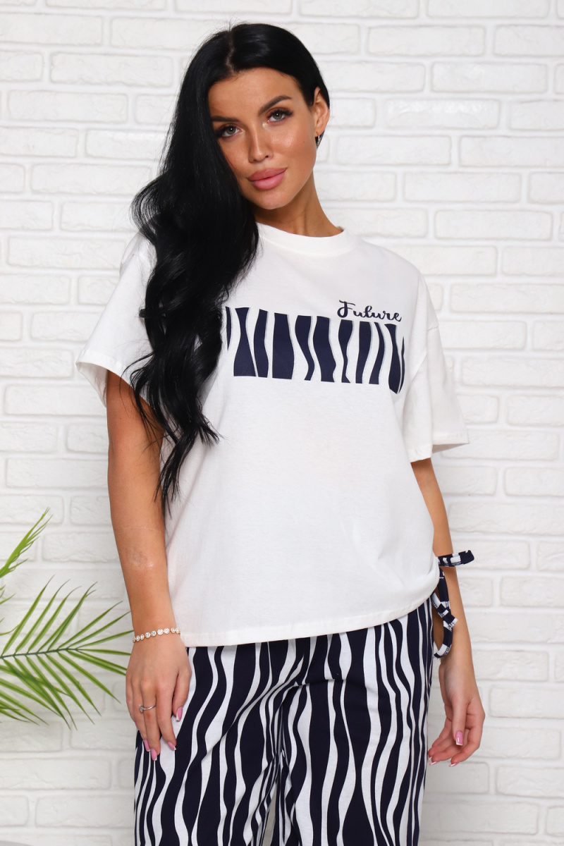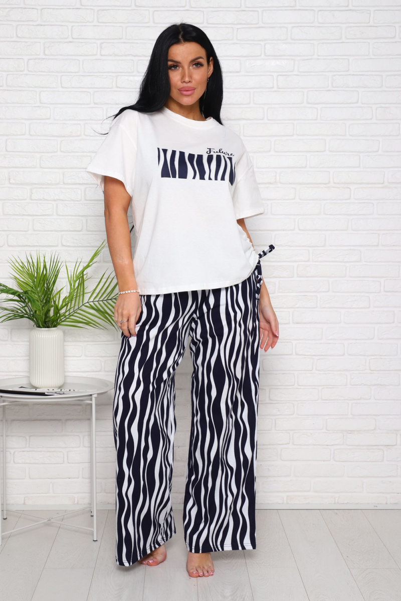 Женский костюм выполнен из трикотажного полотна кулирка. Костюм состоит из футболки и брюк. Футболка свободного силуэта по горловине выполнена обтачка, на полочке пресутсвуют печать, сбоку кулиска. Брюки расклёшенного силуэта по бокам карманы.
